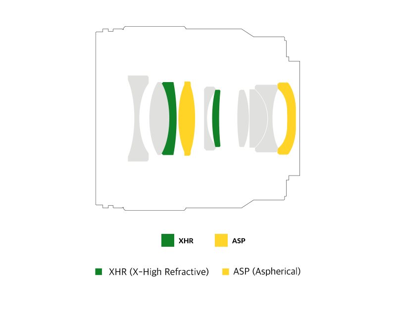 The AF 35mm F1.8 P FE features an advanced optical construction of 10 elements in 8 groups, including 2 ASP (Aspherical) elements and 2 newly developed XHR elements. The XHR (Extra High Refractive) lens element is manufactured with higher precision compared to conventional high-refractive index elements, allowing for a more compact optical structure while effectively reducing optical aberrations.