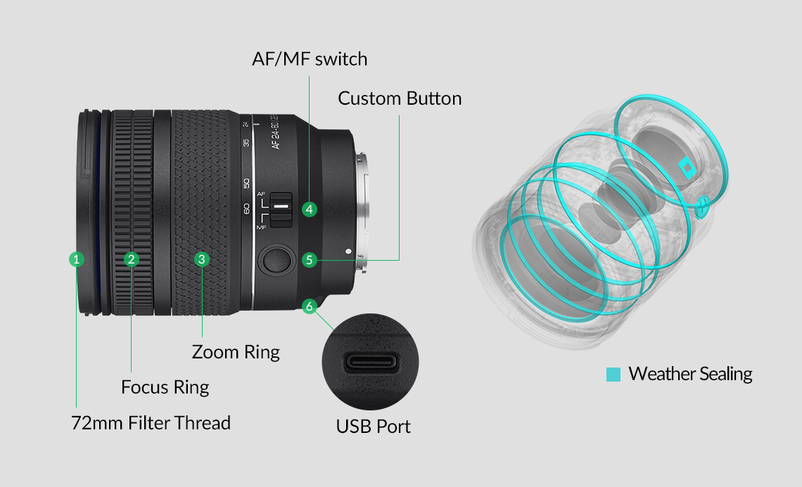 The AF 24-60mm F2.8 FE is built with high-strength materials and a durable design, ensuring reliable performance in a variety of shooting environments.