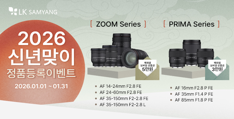 2026 신년맞이 정품등록 이벤트 안내 기간 내 이벤트 대상 렌즈를 구매하시고 정품등록 승인이 완료된 모든 고객님께 선물을 드립니다. ■ 제품 구매 기간 2026년 1월 1일(목) ~ 2026년 1월 31일(토) ■ 정품등록 및 이벤트 응모 기간 2026년 1월 1일(목) ~ 2026년 2월 13일(금) ※ 본 이벤트는 정품등록 승인 완료 기준으로 응모가 인정됩니다. ※ 이벤트 기간 내 제품을 구매하셨더라도, 2026년 2월 13일까지 정품등록 승인이 완료되지 않을 경우 사은품 지급이 불가합니다. ■ 이벤트 참여 방법 Step 3. 2026년 2월 13일(금)까지 ‘정품등록 승인 완료’ 시 이벤트 자동 응모 ■ 사은품 발송 일정 2026년 2월 말 일괄 발송 예정 ■ 이벤트 대상 렌즈 1. Prima 시리즈 - 신세계 백화점 모바일 상품권 (3만원) · AF 16mm F2.8 P FE · AF 35mm F1.4 P FE · AF 85mm F1.8 P FE 2. Zoom Series - 신세계 백화점 모바일 상품권 (5만원) · AF 14-24mm F2.8 FE · AF 24-60mm F2.8 FE · AF 35-150mm F2-2.8 FE · AF 35-150mm F2-2.8 L ----------------------------------------------------------------------------------------------------------------------- ■ 유의 사항 · 본 이벤트는 2026년 1월 1일(목)부터 2026년 1월 31일(토)까지 이벤트 대상 제품을 구매하고, 2026년 2월 13일(금)까지 정품등록 승인이 완료된 고객에 한하여 참여가 가능합니다. · 본 이벤트는 별도의 응모 페이지나 구글폼 제출 없이, 정품등록 승인 완료 시 자동으로 응모 처리됩니다. · 정품등록 시 수집되는 개인정보는 이벤트 운영 및 사은품 발송 목적으로 활용되며, 개인정보 수집 및 이용에 동의하지 않을 경우 이벤트 참여 및 사은품 지급이 불가합니다. · 중고, 양도, 환불된 제품, 사은품 또는 경품으로 제공된 제품은 이벤트 대상에서 제외됩니다. · 반드시 이벤트 대상 렌즈를 정품등록해야 이벤트 응모가 가능합니다. · 정품등록 완료 후라도 등록 취소, 양도, 재판매, 환불 등으로 구매 사실이 무효화될 경우 이벤트 혜택이 취소될 수 있습니다. · 정품등록 시 기본 제공되는 커피 기프티콘 사은품은 본 신년맞이 이벤트 사은품과 중복 제공되지 않습니다. (본 이벤트 참여 시 커피 기프티콘 대신 신년맞이 이벤트 사은품이 제공됩니다.) · 정품등록 신청 후 승인까지는 최대 3영업일이 소요될 수 있으며, 승인 완료 시점을 기준으로 이벤트 참여 여부가 판단됩니다. · 정품등록 시 영수증, 매출전표, 온라인 주문내역 등 구매일자가 확인 가능한 구매 증빙 자료 제출이 필요합니다. · 구매 증빙은 신용카드 영수증 또는 국세청 승인 현금영수증만 인정되며, 구매일 확인이 불가능한 간이영수증, 거래명세서 등은 인정되지 않습니다. · 본 이벤트는 사은품 한정 수량 소진 시 예고 없이 조기 종료될 수 있으며, 회사 사정에 따라 이벤트 내용 및 일정이 변경될 수 있습니다. ■ 이벤트 신청 안내 · 본 이벤트는 정품등록 승인 완료 시 자동 응모 방식으로 운영되며, 별도의 추가 신청 절차는 없습니다. · 이벤트 응모 조건을 충족하지 않은 경우(구매 기간 미해당, 정품등록 미승인, 승인 기한 초과 등) 사은품 지급이 불가합니다. · 실제 구매하지 않은 제품을 등록하거나 허위 정보로 이벤트에 참여한 경우, 정품등록 및 이벤트 혜택이 취소되며 필요 시 법적 조치가 취해질 수 있습니다. ■ 사은품 발송 안내 · 사은품은 정품등록 시 입력한 회원정보(연락처)를 기준으로 발송됩니다. · 신청 후 정보 변경이 어려우므로 반드시 정확하게 입력해 주시기 바랍니다. · 연락처 오기재 등 고객 귀책 사유로 인한 미수신에 대해서는 재발송이 불가할 수 있습니다. · 사은품은 2026년 2월 말 일괄 발송 예정이며, 개인 요청에 따른 선발송은 불가합니다. ■ 이벤트 및 사은품 관련 문의 · 이벤트 관련 문의는 LK SAMYANG 공식 홈페이지 1:1 문의를 통해 접수해 주시기 바랍니다. · 이벤트 관련 문의는 이벤트 종료 후 1개월 이내에 한하여 접수 가능합니다. |