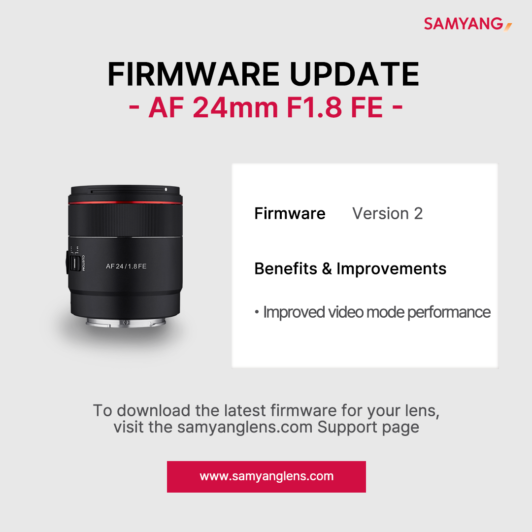 [Firmware Update for the AF 24mm F1.8 FE] Dear AF 24mm F1.8 FE users, A new Firmware(Version 2) is downloadable on the website! The new Firmware has improved video mode performance.