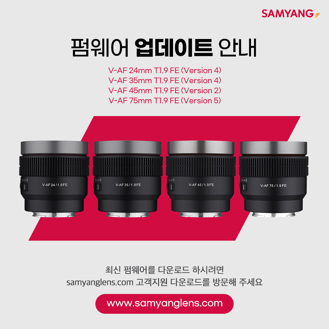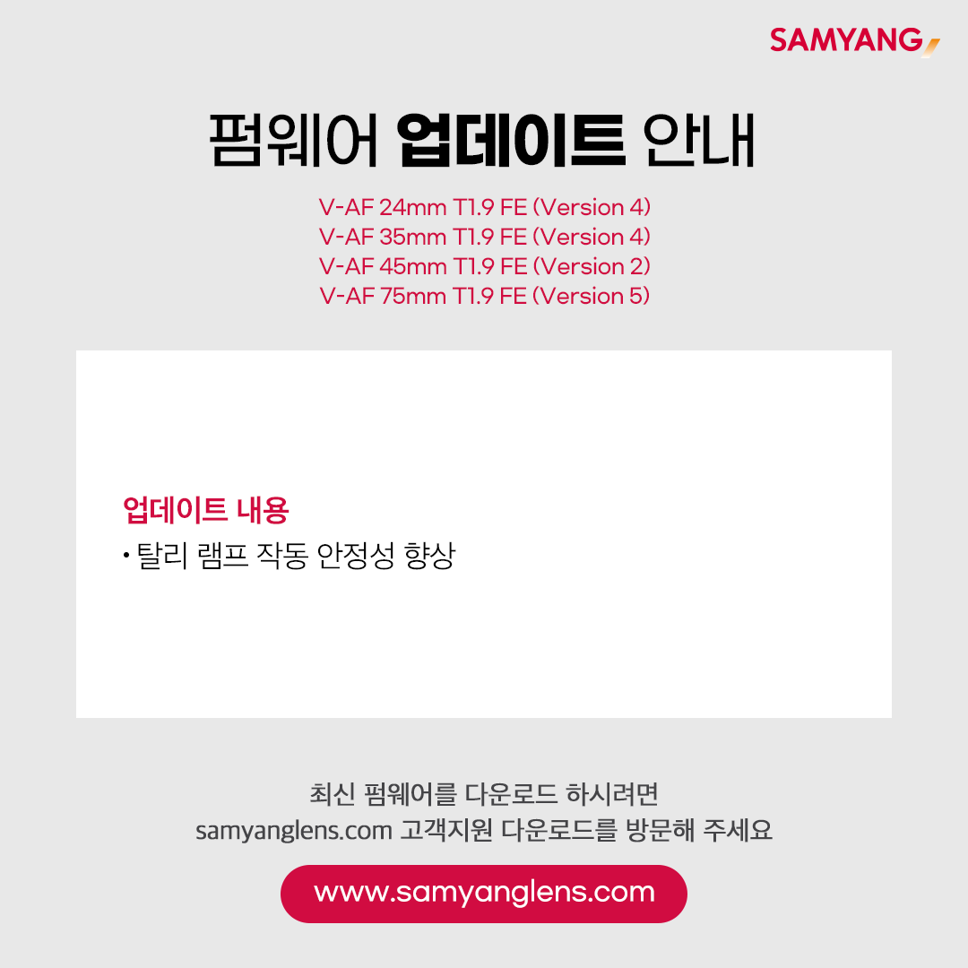 - V-AF 24mm T1.9 FE (Version 4) - V-AF 45mm T1.9 FE (Version 2) [업데이트 내용] - 탈리 램프 작동 안정성 향상 삼양의 AF 렌즈 펌웨어 업데이트는 전용 악세서리인 렌즈 스테이션 사용으로 직접 하실 수 있으며, 삼양 서비스 센터인 삼정사 (02-777-3989) 방문을 통해서도 서비스 받으실 수 있습니다. |